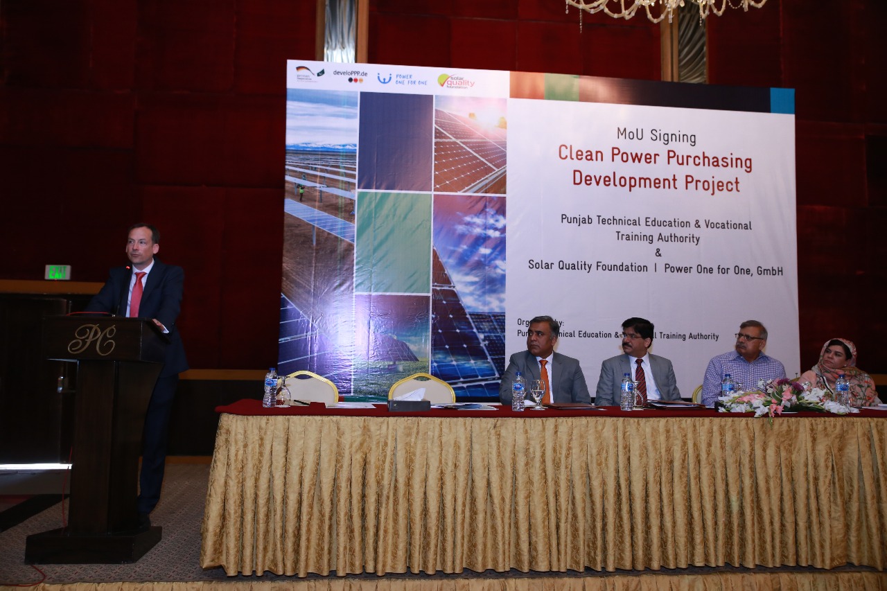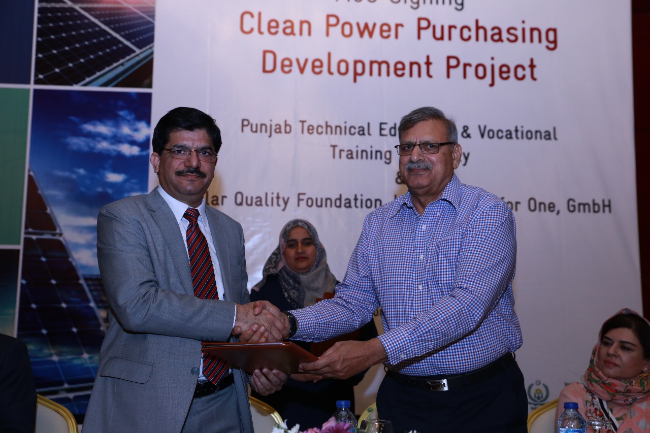Lahore, May 2, 2019: Two leading German energy companies, a Pakistani association of energy companies and Punjab TEVTA have signed an MoU to promote quality training of solar technicians in Punjab. The Memorandum of Understanding (MoU) is signed bwteen Technical Education and Vocational Training Authority (TEVTA), Power one for one, Aream GmbH and Solar Quality Foundation (SQF) to launch Clean Power Purchasing Development Project.